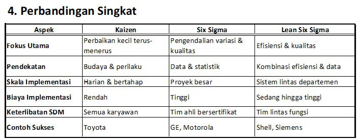 Dalam dunia bisnis modern, Kaizen, Six Sigma, dan Lean Six Sigma menjadi tiga pendekatan utama dalam meningkatkan kualitas dan efisiensi. Ketiganya berfokus pada continuous improvement, tetapi memiliki metode dan filosofi yang berbeda. Jadi secara umum Kaizen, Six Sigma, dan Lean Six Sigma merupakan usaha-usaha atau diharapkan menjadi suatu Pendekatan Terbaik untuk Perbaikan Berkelanjutan